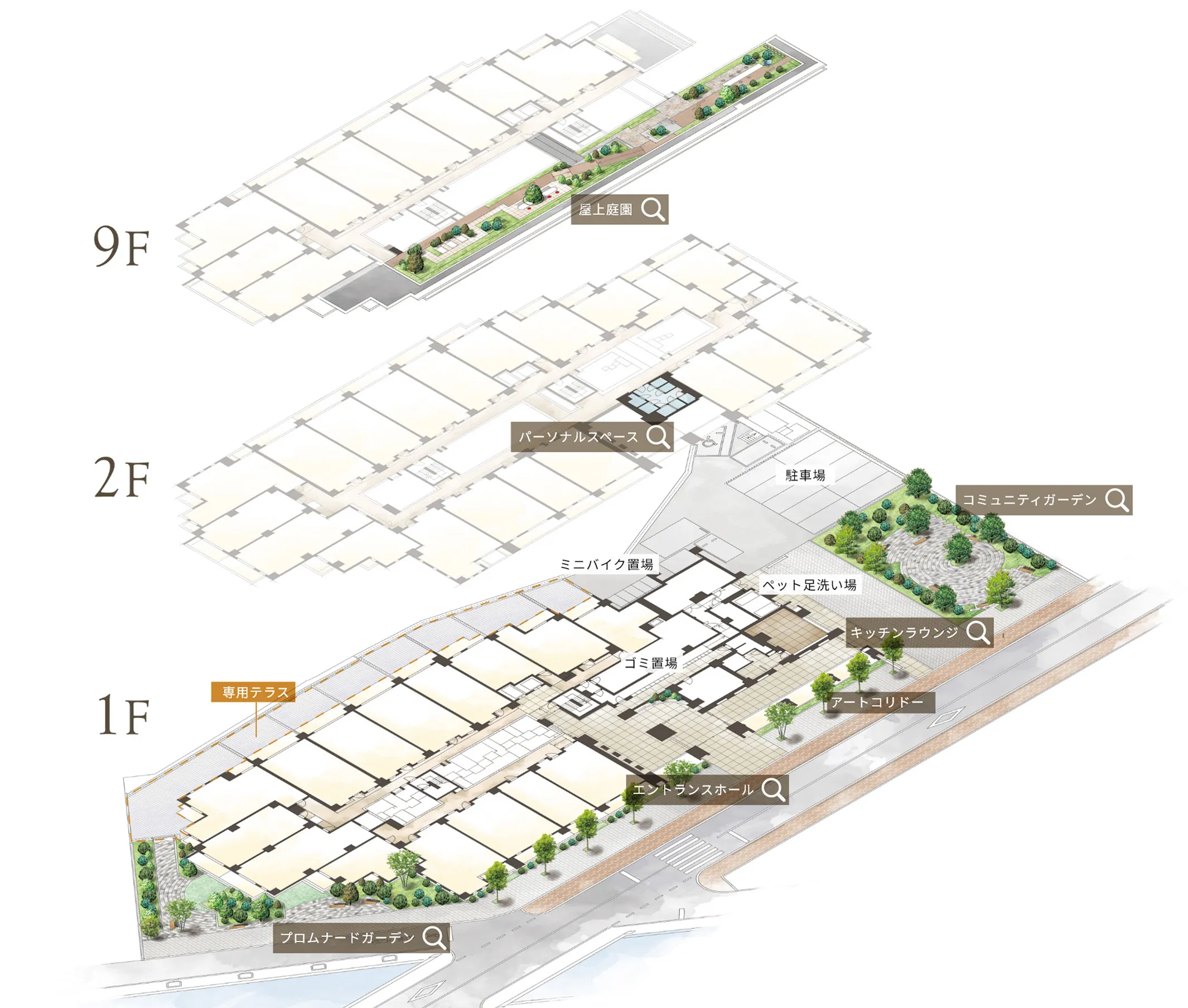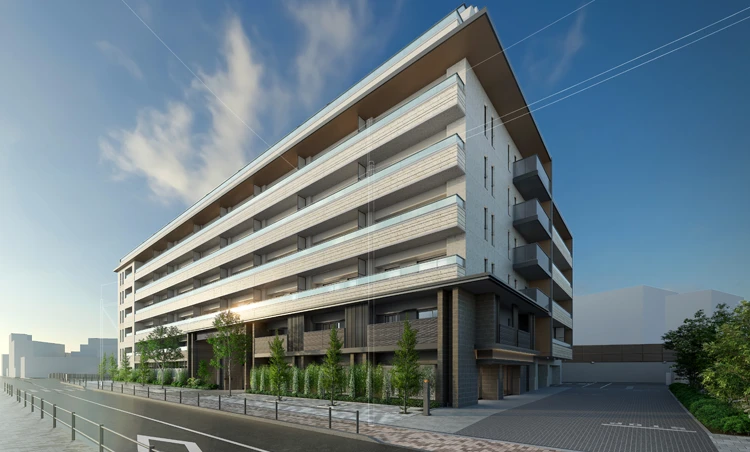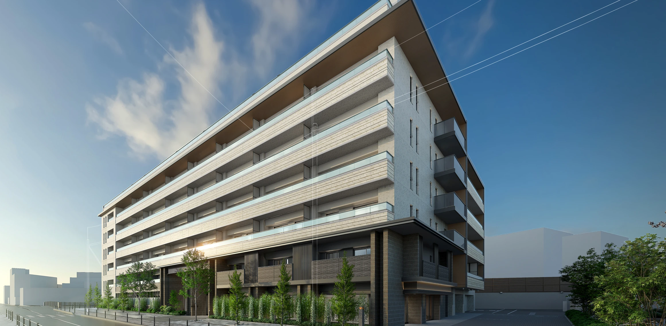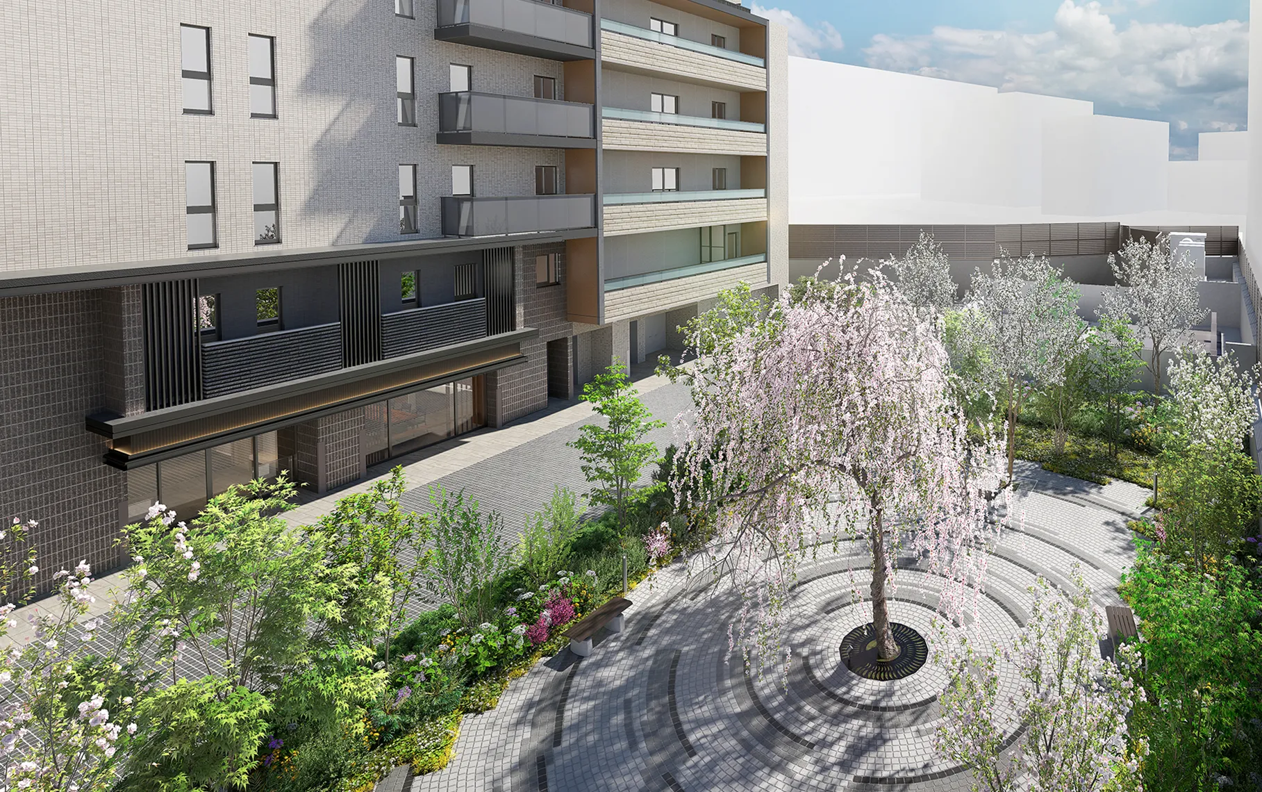 ※掲載のプロムナードガーデン完成予想CGは、計画段階の図面を基に描き起こしたもので、形状・色等は実際とは見え方が異なったり変更する場合があります。外観および内部形状の細部、設備機器等は表現しておりません。施工上の都合により、設備位置等が変更となる場合があります。また、周辺建物を表現した箱は、現地周辺都市データ(2025年7月時点)を基に描き起こしたもので、建物の形状・距離・色等は実際とは異なります。