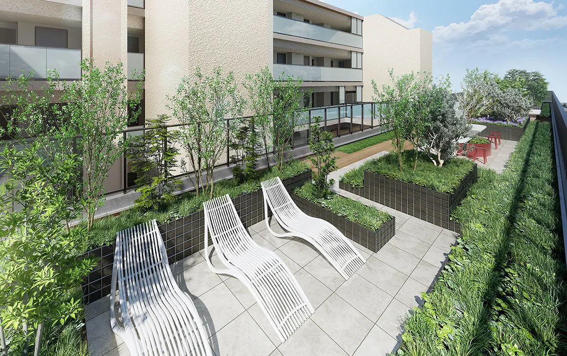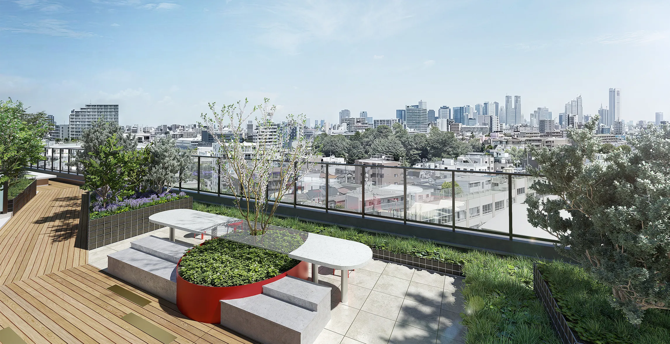 ※掲載のコミュニティガーデン完成予想CGは、計画段階の図面を基に描き起こしたもので、形状・色等は実際とは見え方が異なったり変更する場合があります。外観および内部形状の細部、設備機器等は表現しておりません。施工上の都合により、設備位置等が変更となる場合があります。また、周辺建物を表現した箱は、現地周辺都市データ(2025年7月時点)を基に描き起こしたもので、建物の形状・距離・色等は実際とは異なります。