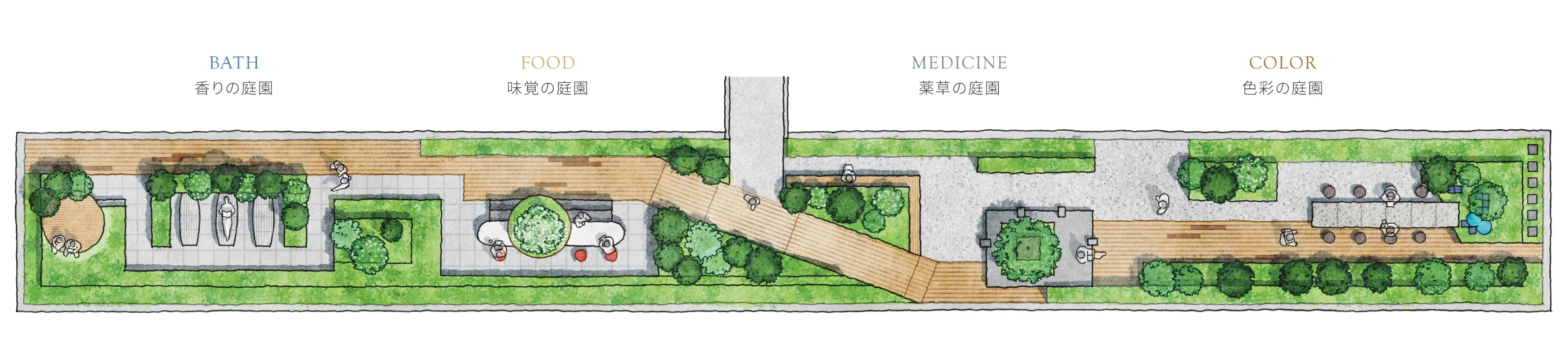 香りが良く入浴に活用されてきたエゴノキやセキショウなどのハーブが香る、木漏れ日の中でリラックスできる空間。