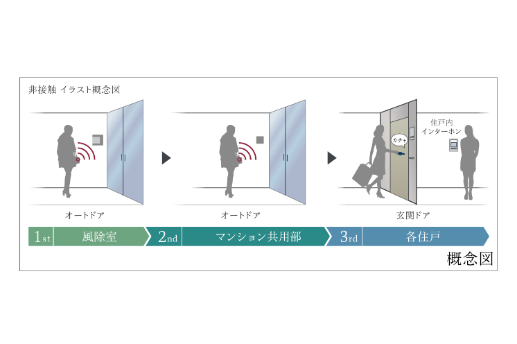 風除室およびマンション共用部に入る際のセキュリティチェックは、非接触による認証方式を採用しています。