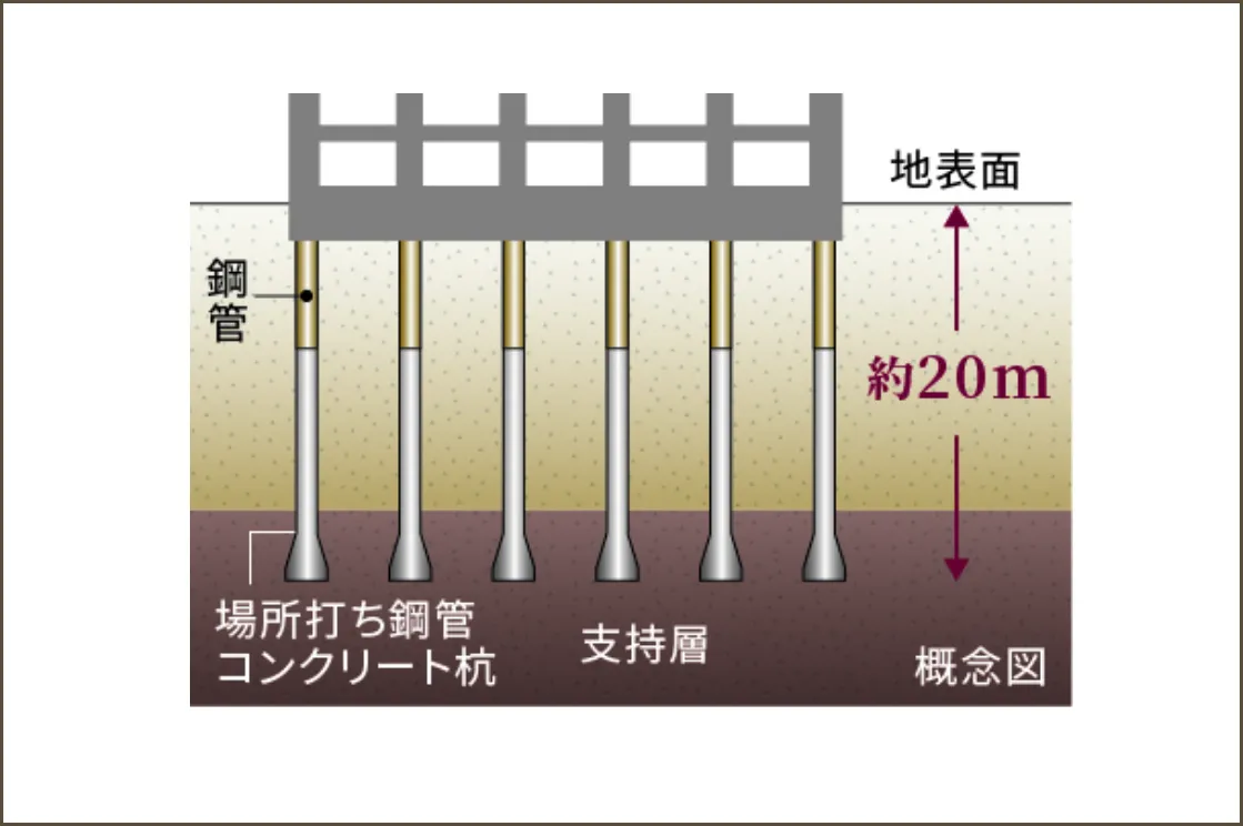 地表面から約20mの平均N値50以上の支持層まで杭を打設。直径約1.4m~約2.4mの合計31本の杭が建物の重量を支えます。また、杭が支持層と接する部分には、杭径を最大約3.0mまでスカート上に拡大する拡底杭にしています。