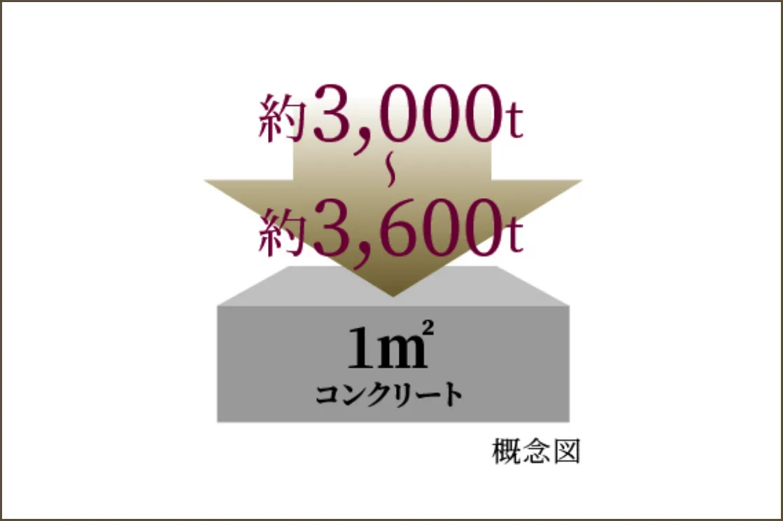 建物の主要な構造部には、設計基準強度30N/㎟~36N/㎟のコンクリートを使用。これは、1㎡当たり約3,000トンから約3,600トンの圧縮力に耐えられる強度です。